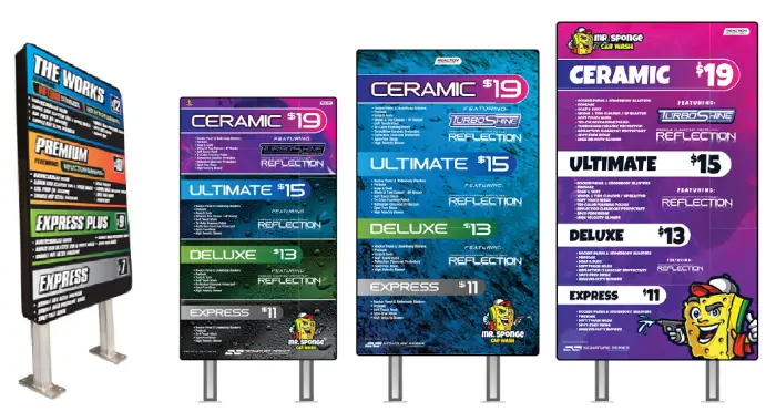 Elevate your car wash’s visual appeal and customer experience with the Reaction Menu Sign, a dynamic tool designed to showcase your services with clarity and style. This customizable sign serves as a vibrant focal point, drawing customers’ attention and guiding them through your range of wash programs effortlessly.
